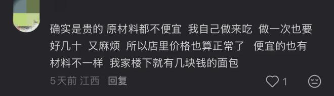 其实在社交媒体上关于天价面包的讨论不断,比如去年某网红面包店一款售价为128元的黑山吐司面包就冲上热搜。