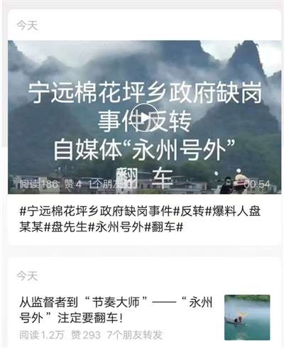8月24日,一个由宁远当地某委干部打理的微信公众号发布文章《从监督者到“节奏大师”“永州号外”注定要翻车!》和视频《宁远棉花坪乡政府缺岗事件反转,自媒体“永州号外”翻车》。