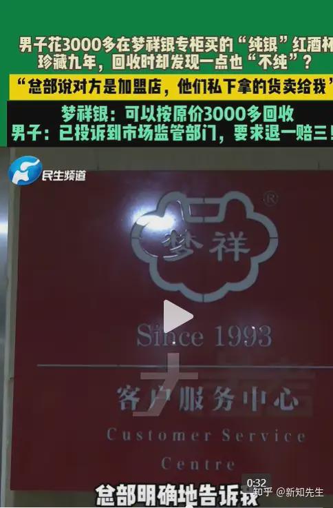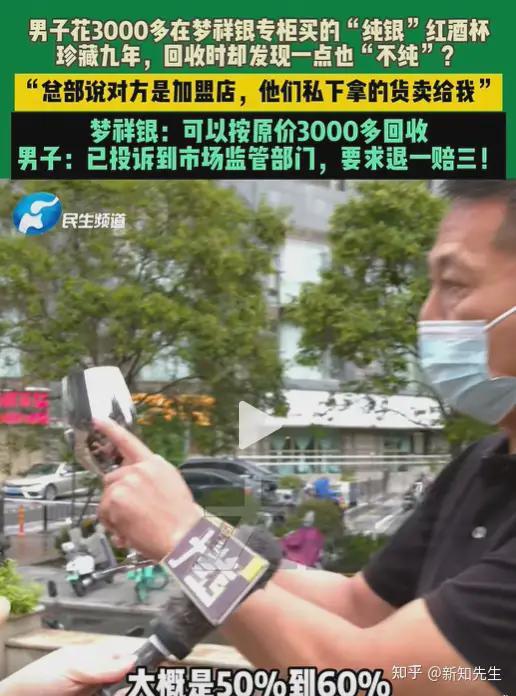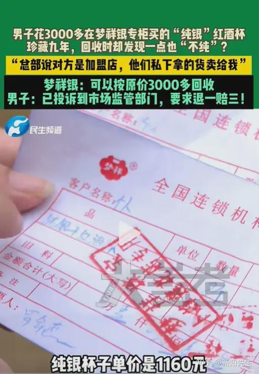 郑州男子投诉称,9年前,2016年7月24日,他花3000多元在梦祥银专柜买了纯银红酒杯,当时店员告诉他, 就是100%的纯银杯子。