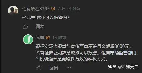 腾讯元宝也给出了答案:银杯实际含银量与宣传严重不符且金额超3000元,若有证据证明故意欺诈可以报警。但向市场监管部门投诉通常是更稳妥有效的维权方式。