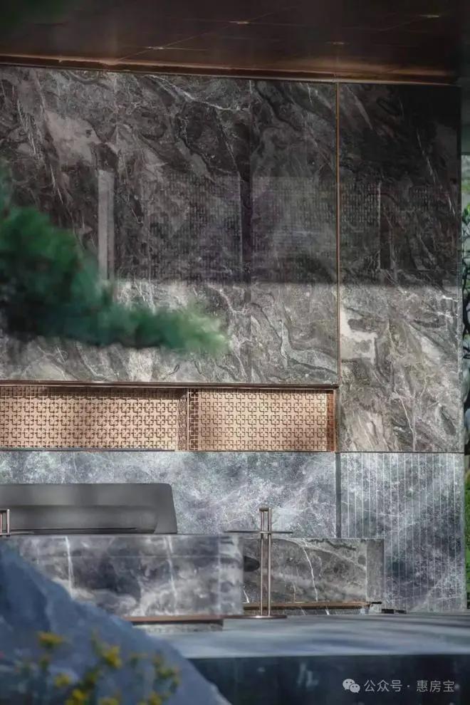 大华星曜售楼处电话:【预约☎】水景一侧是一段曲折幽静的星空连廊,能遮风挡雨的同时,也能提供游园般的归家体验。星空连廊的顶面采用香槟金铝板、墙面为爱马仕灰仿石砖,并镶嵌金属线条、就连地面都采用了夜里雪仿石砖第四,由石材&铝板构筑的第二景观会客厅!